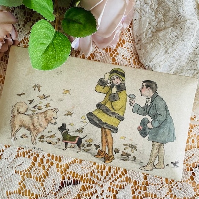 フランスで出逢いました。 セルロイドでできた、アンティークのポストカードです。 セルロイド製のカードは主に1900年~1930年代にかけて作られていたそうで、半透明のカードにダイカットなどが貼られていたり、絵が描かれていたり。オンリーワンの雰囲気たっぷり。贈り手の心がこもった、あたたかみのあるカードです。 こちらのカードも職人さんの手描きのカード。 ピンクのバラが描かれ、縁取りにはお祝いにふさわしいゴールドの飾りが描かれています。 セルロイドの性質上、完璧なコンディションのまま現存するものは少なく、こちらのカードも、経年による変色、歪み、プリントのかすれ、シミや汚れなどはございます。 長い時を経てきたアンティークの風合いとご理解いただき、お楽しみいただけますと幸いです。 サイズ:13.4cm×8.7cm (多少の誤差はご容赦ください) 追跡有り---------------------------------------- ●クリックポスト(神奈川県からの発送です)