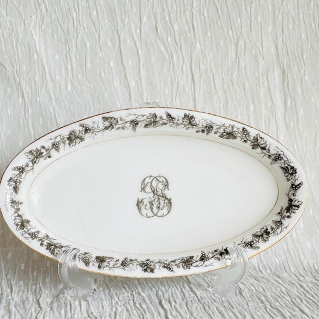 フランスのアンティーク市で見つけました。 古いラヴィエです。 ゴールドのラインが二本、そして中心にモノグラム。 富の象徴として愛されていた葡萄のモチーフに、ハンドペイントで施された白いドット。 イニシャル入りでオーダーメイドされたものではないかとのこと。 バックスタンプも、セットで作られたため全部に入っていないのだと思われます。 オリジナルで希少なお品。 時間をさかのぼって思いを馳せる楽しみがありそうです。 古いものですので経年による変色やシミ、汚れ、貫入、傷やペイントの剥がれ、擦れ、などもございます。 長い時間を経てきたアンティークの風合いとご理解いただきまして、お楽しみいただけますと幸いです。 サイズ:23.5㎝×13.4㎝ 高さ3.5㎝ (多少の誤差はご容赦ください) 《お届け》 追跡有り---------------------------------------- ●ゆうパック/他(神奈川県からの発送です)