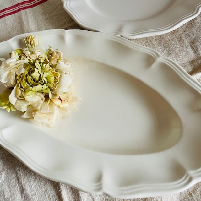 フランスで出逢いました。 サルグミンヌの人気の花リムシリーズ、ラヴィエです。 やさしいアイボリーの色に、ゆらゆら波打つリム。 シンプルですが、可愛らしさも兼ね備えたお品です。 古いものですので経年による変色やシミ、製造時の異物混入やキズ、そして一か所、写真でご覧いただけるような小さなチップがございます。 長い時間を経てきたアンティークの風合いとご理解いただきまして、お楽しみいただけますと幸いです。 サイズ:27㎝×17㎝ 高さ2.5㎝ (多少の誤差はご容赦ください) 《お届け》 追跡有り---------------------------------------- ●ゆうパック/他(神奈川県からの発送です)