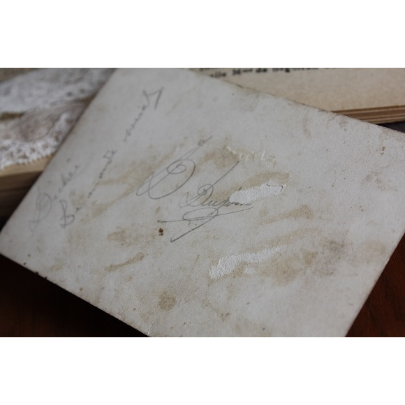縁にはゴールド、裏面に鉛筆で文字が書かれています。