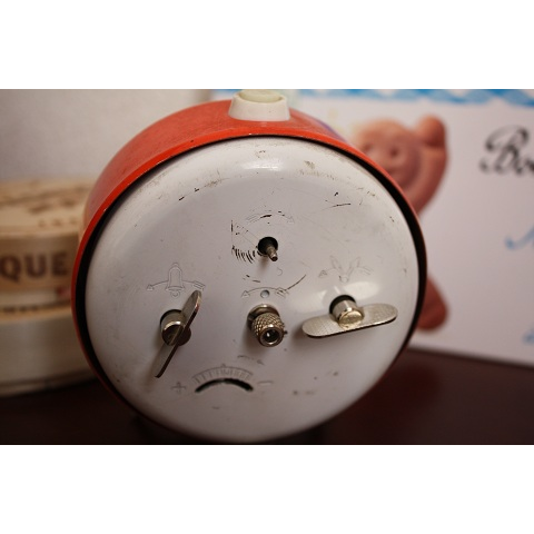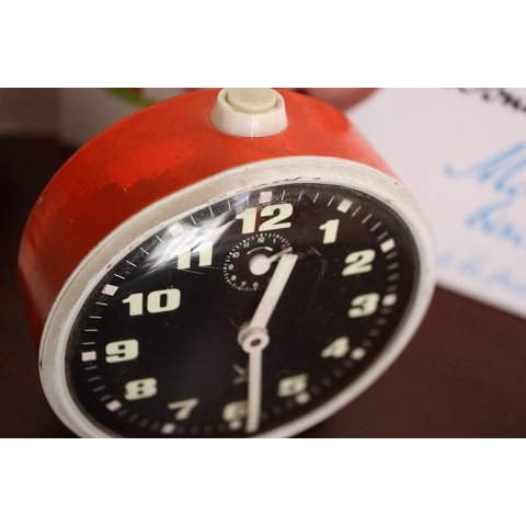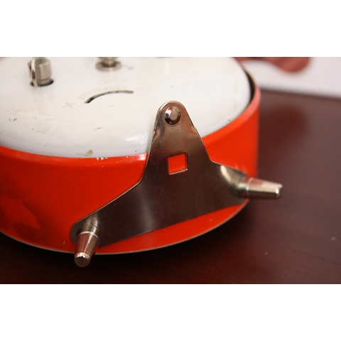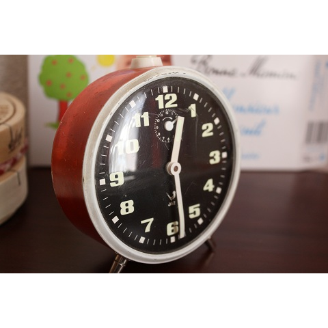 ボディがオレンジがかった朱色で、文字盤がブラックのこの目覚まし時計。