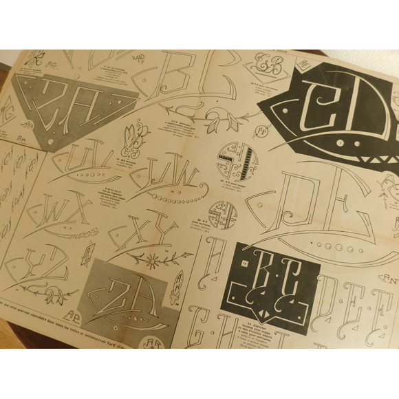 開くと一枚物の大きな紙に、モノグラムなどの見本がおさめられているお品。