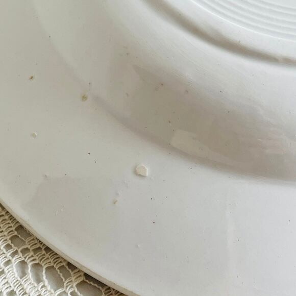 古いものですので経年によるシミや汚れ、カトラリーによる傷、製造時の異物混入や色飛び、ペイントの擦れなどもございます。