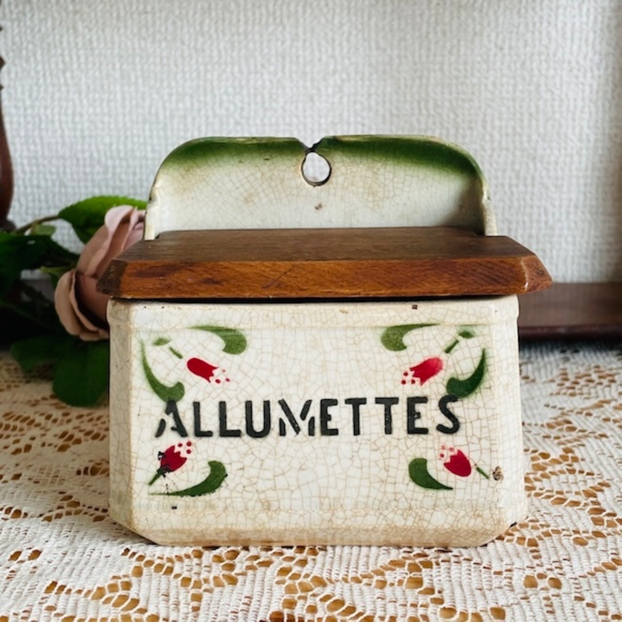 グリーンのグラデーションとお花のくすんだ赤い色が、ALLUMETTESの書体にマッチして美しいお品です。