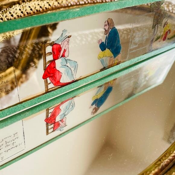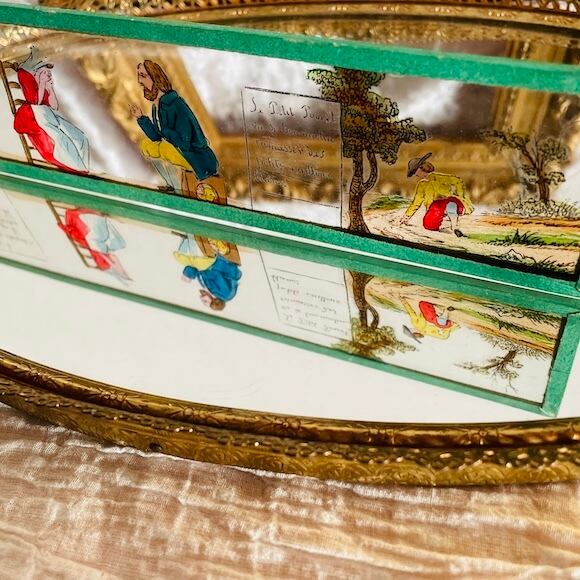 古いものですので縁取りの紙に破れも見られますし、ガラス絵の部分に傷や汚れ、アウトラインや色の剥がれ、なども見られます。