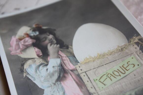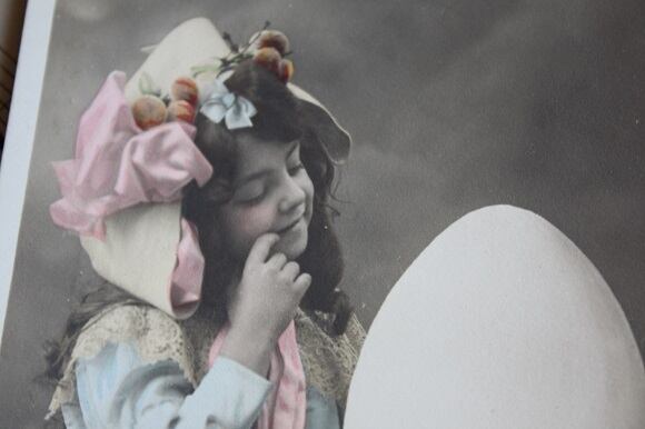 少女がイースターエッグを前に、嬉しそうに微笑んでいます。