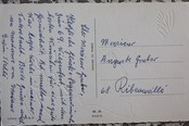 パープルのリボンが結ばれた花束に、蝶々が遊びに来ている絵の、かわいらしいカードです。