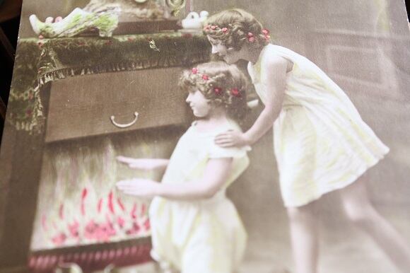 冷えた体を、暖炉の前で仲良くあたためているように見えます。