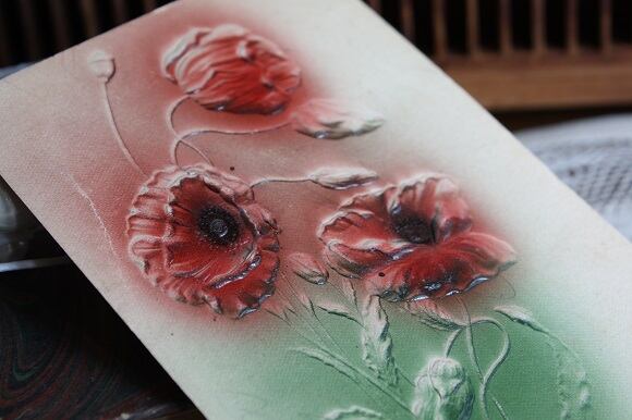 フランス アンティークポストカード 二色で色付けされたエンボスのポピー [s0067fc]